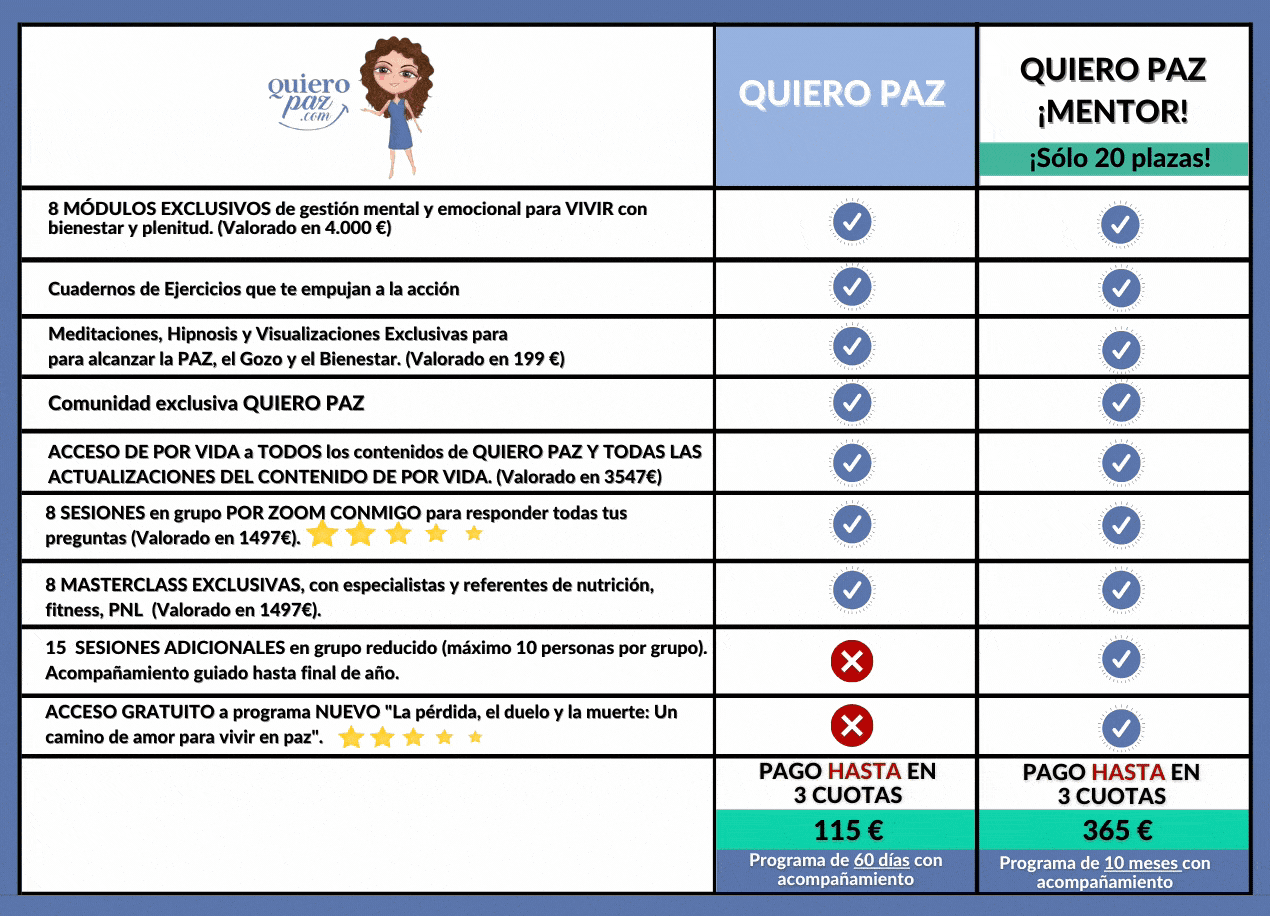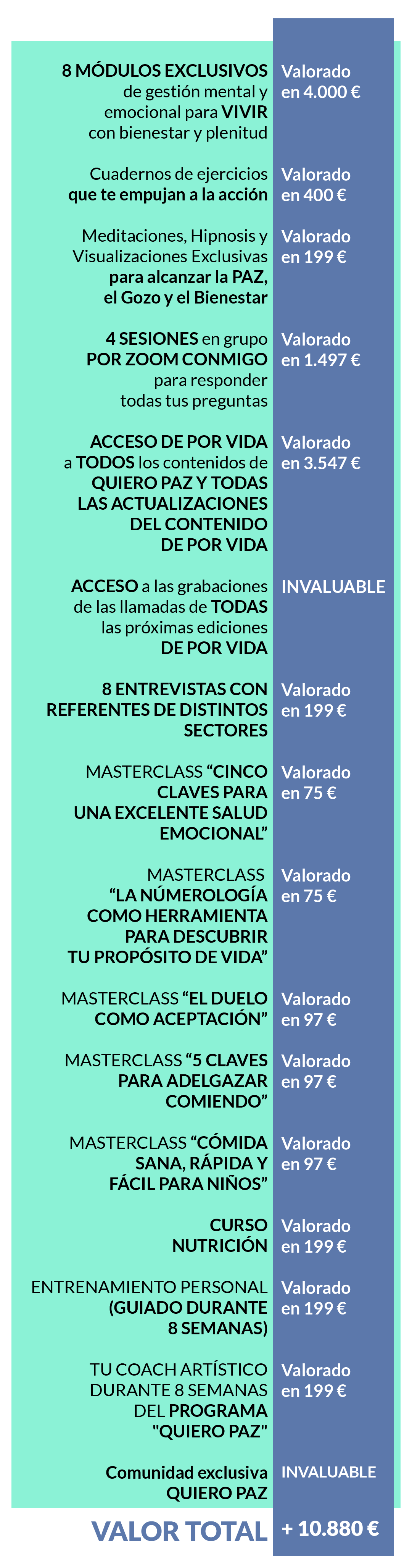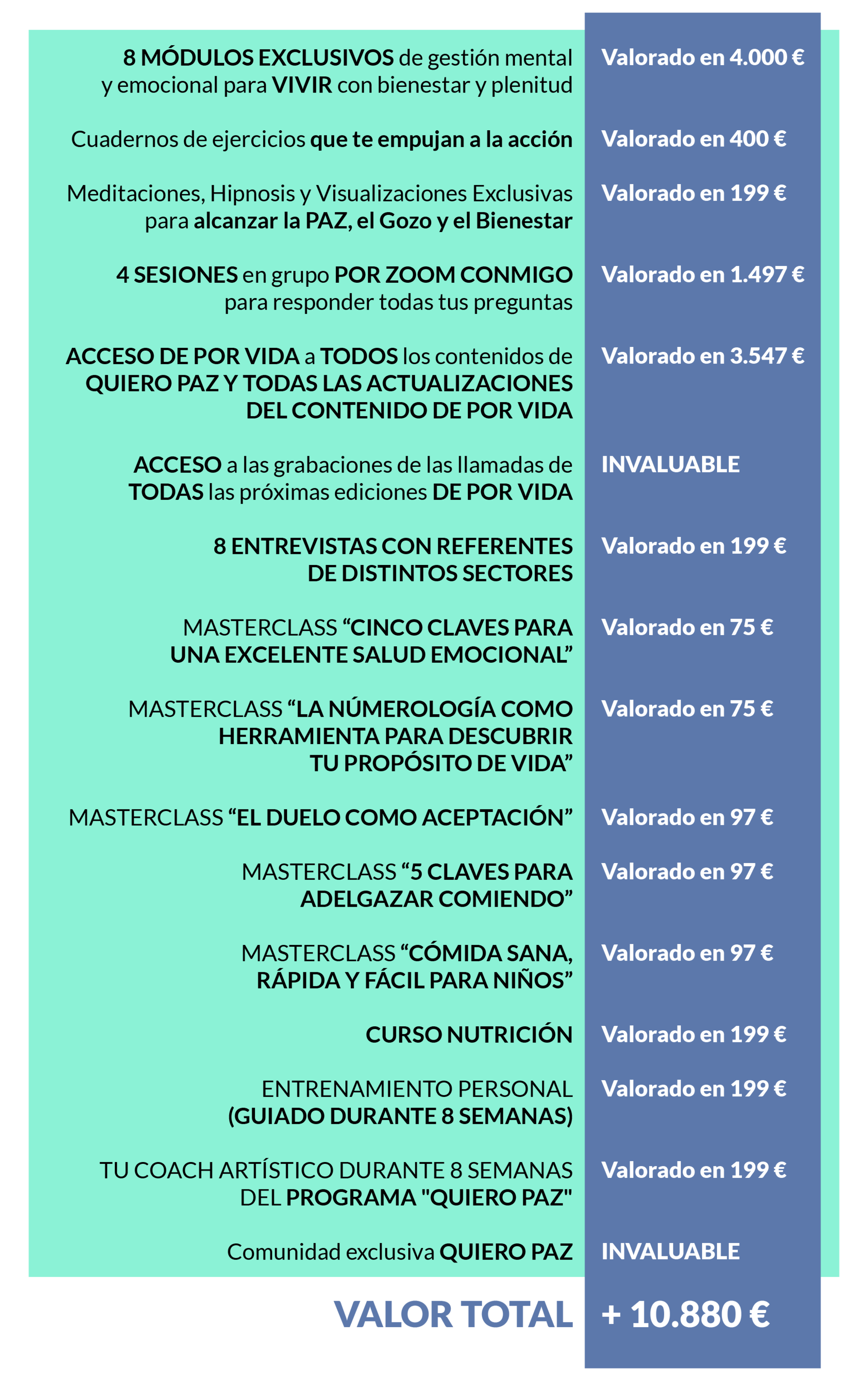 La transformación: Viven una transformación profunda, que no se consigue con sólo información o consumiendo más contenidos. La persona que vive la experiencia de QUIERO PAZ es totalmente diferente a la persona que lo empezó.